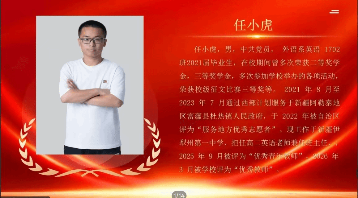 任小虎,来自外语系英语1702班,现服务于新疆伊犁州第一中学,深耕基层教育一线。他分享了西部服务的初心与感悟,号召大家投身西部、奉献青春。