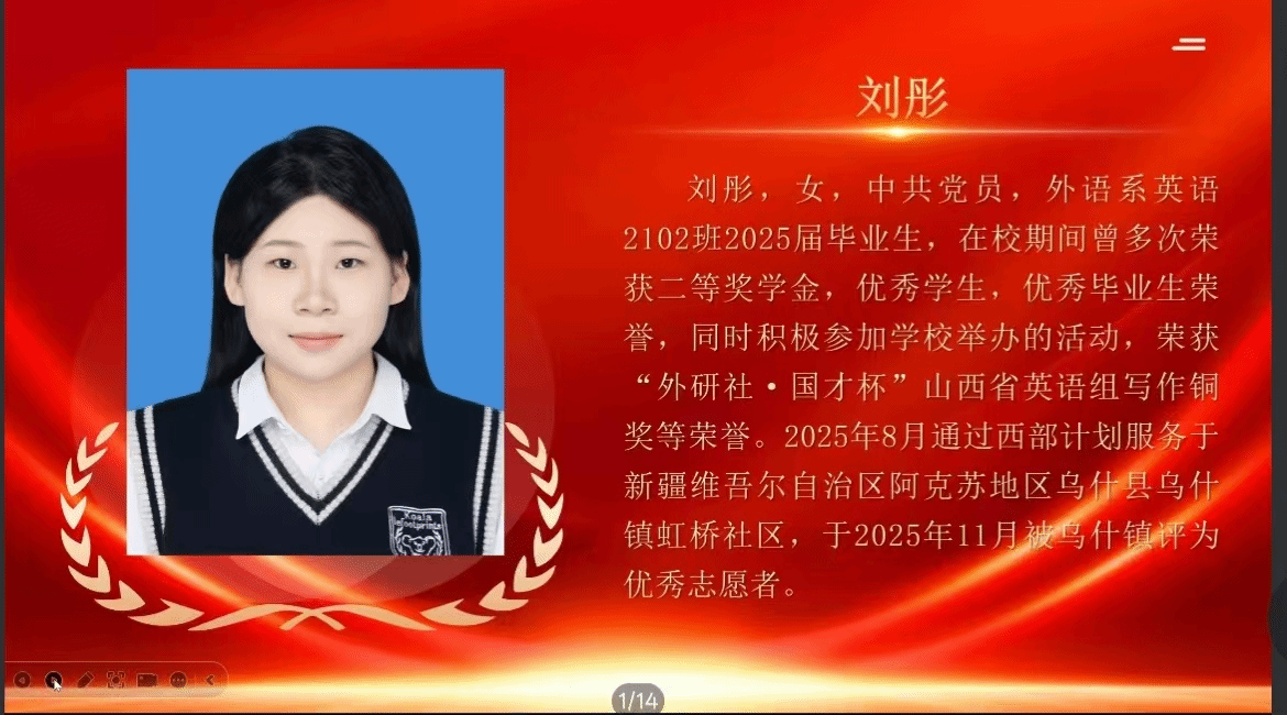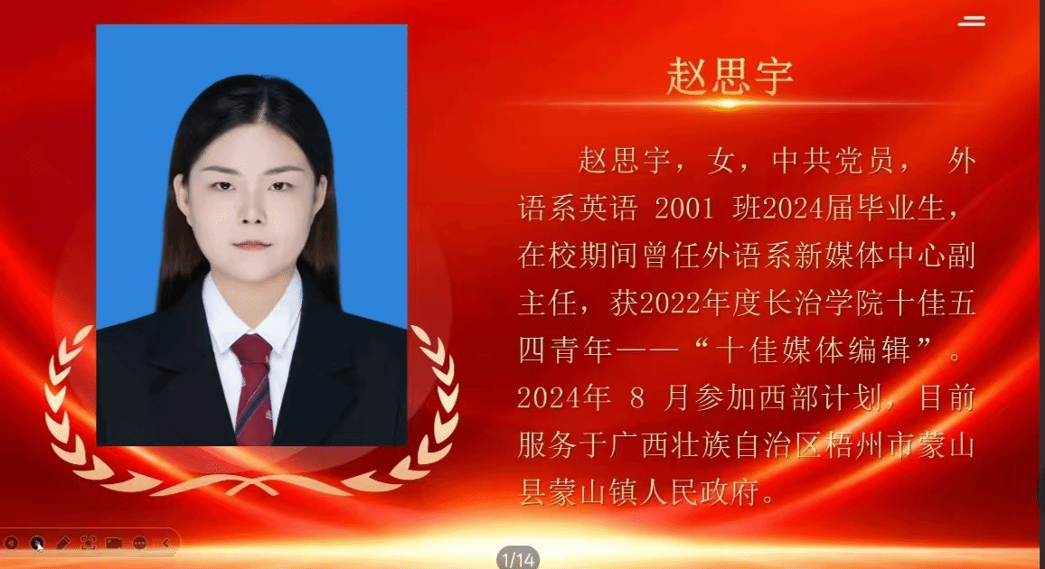 杨小洁,来自外语系英语23专升本2班,现服务于山西省大同市新荣区西村乡人民政府,服务乡村发展。她分享了乡镇工作的成长与感悟,鼓励大家投身西部建设,绽放青春光彩。